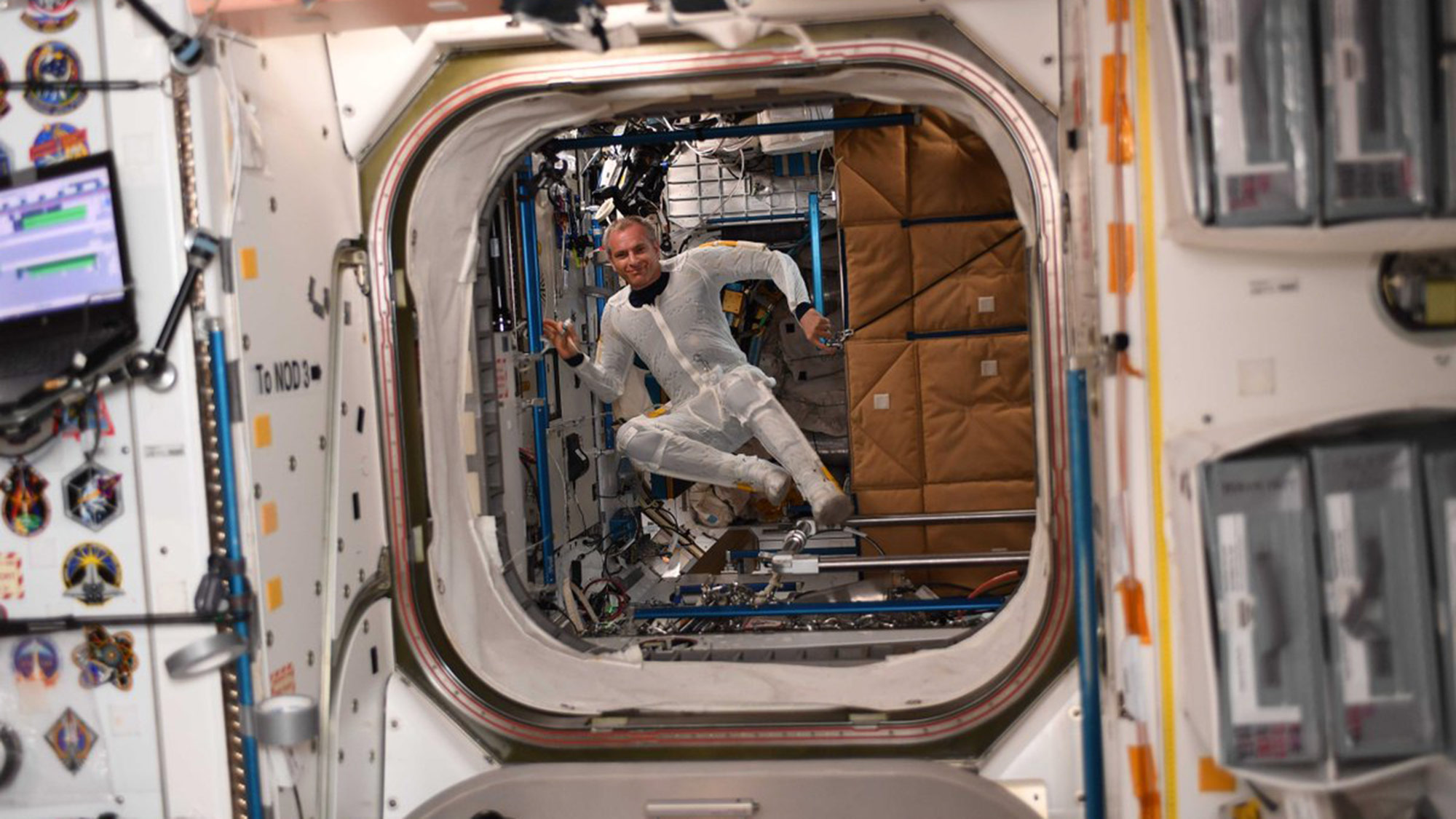 Canadian Space Agency astronaut David Saint-Jacques adjusts the sizing of his spacesuit to prepare for an upcoming spacewalk. "We tried our spacesuits on today to adjust for space growth!" he tweeted with this photo, on March 4, 2019.