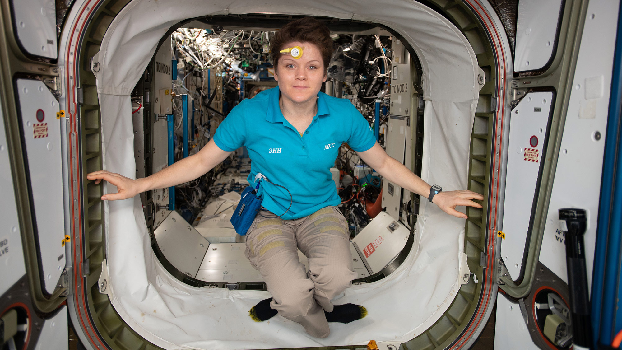 Floating between the Harmony module and the Destiny laboratory module, NASA astronaut Anne McClain dons a data collection senor for the Circadian Rhythms experiment on her forehead. The experiment aims to understand how an astronaut's "biological clock" changes during long-duration spaceflight.