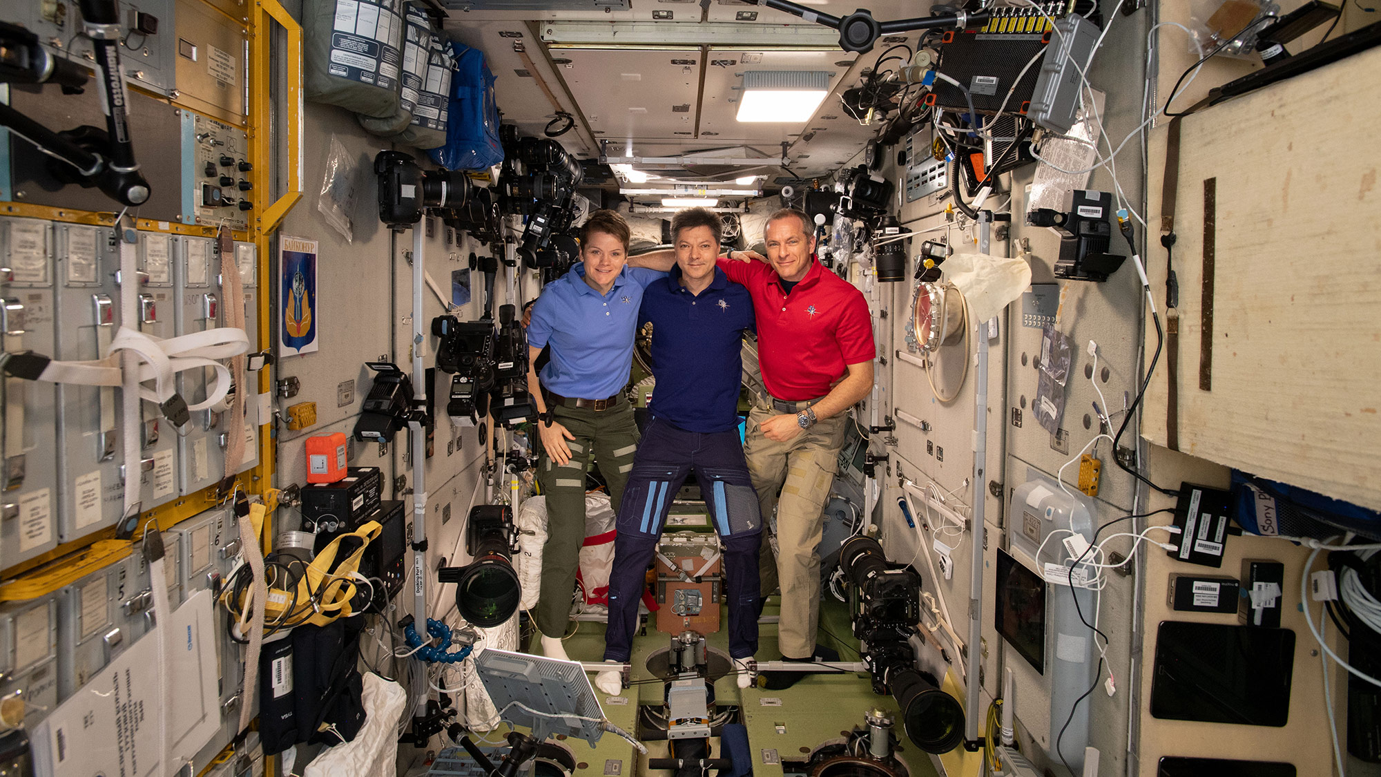 Inside the space station's Zvezda service module, the Expedition 58 members pose assemble for a crew photo on Dec. 29, 2018. From left to right are NASA astronaut Anne McClain, Russian cosmonaut Oleg Kononenko and Canadian Space Agency astronaut David Saint-Jacques.