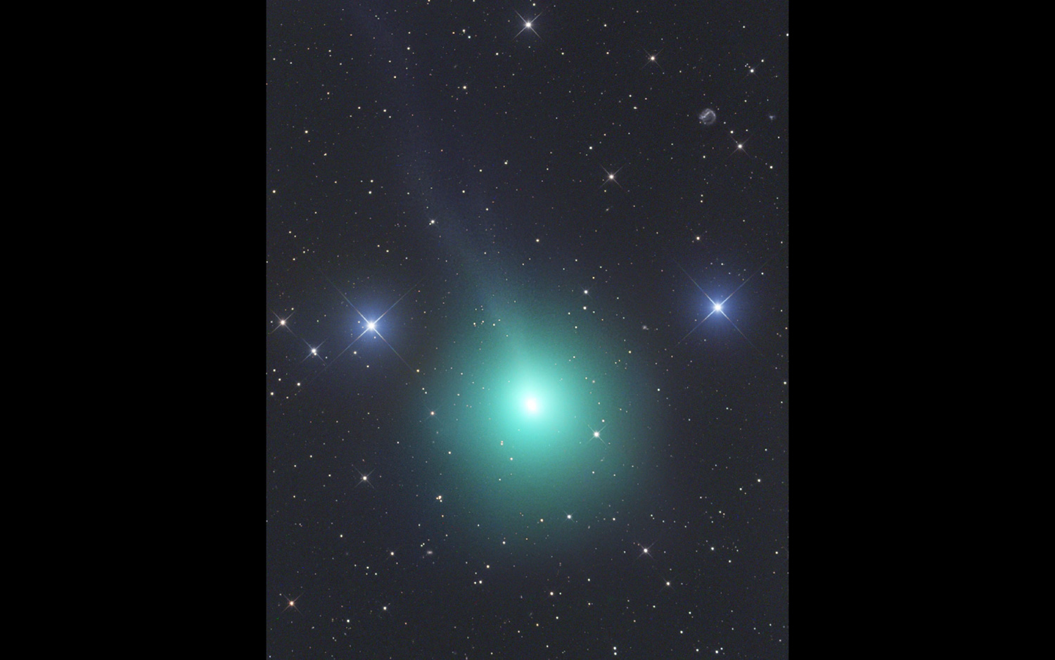 Another image by astrophotographer Gerald Rhemann reveals Comet 2018/Y1 Iwamoto's vibrant coma glowing bright-green in the Virgo constellation on Feb. 8, 2019.