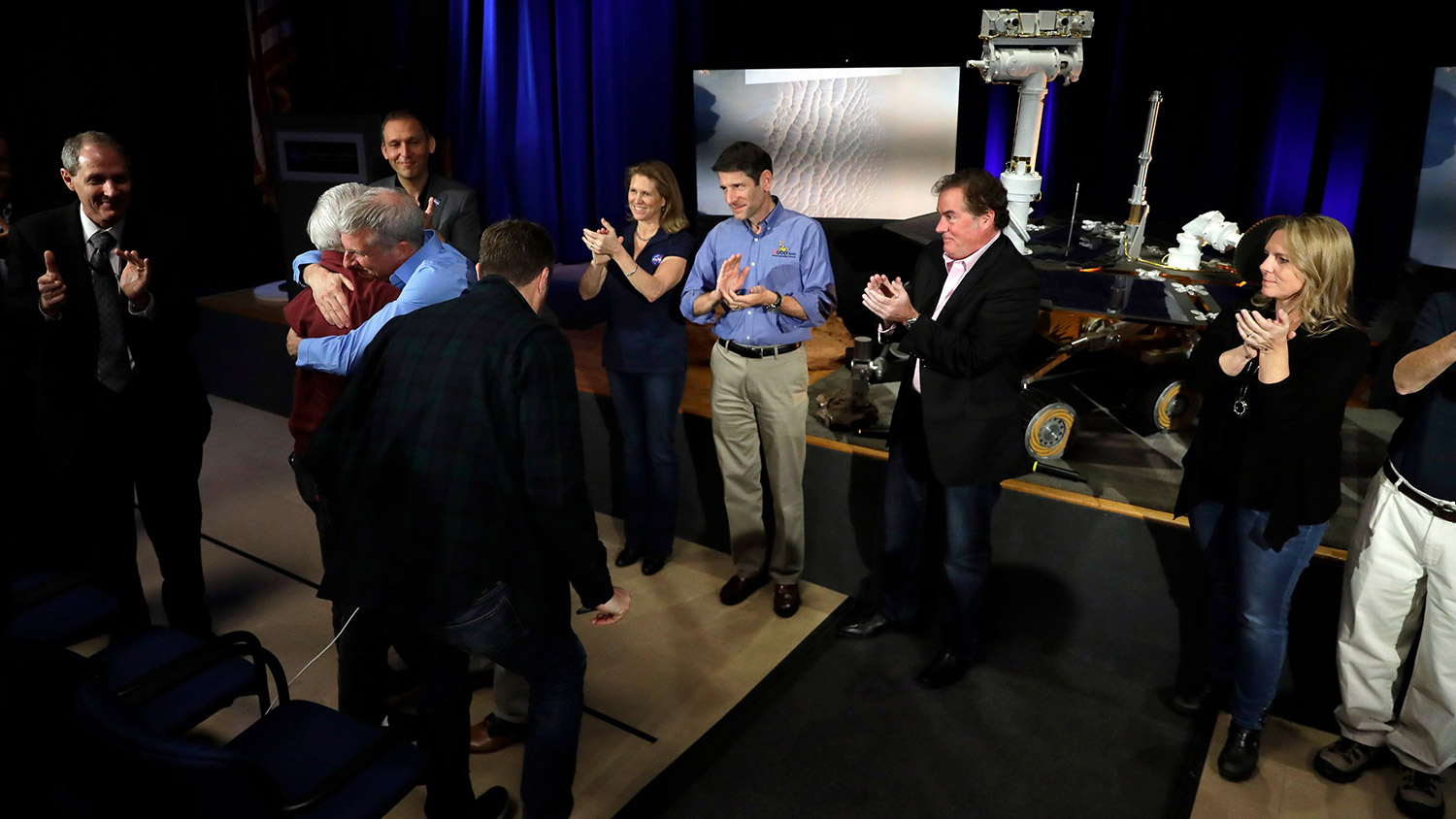 A group of NASA scientists and senior officials mark the conclusion of the Opportunity rover mission with applause and hugs. The end of the Opportunity mission was announced on Feb. 13, 2019.