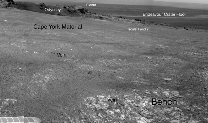 Endeavour is a giant impact crater about 14 miles (22 kilometers) across. Opportunity just arrived at its rim on Aug. 9, at a site called "Cape York." The region looks completely different than other parts of Mars that Spirit and Opportunity have explored, researchers said.