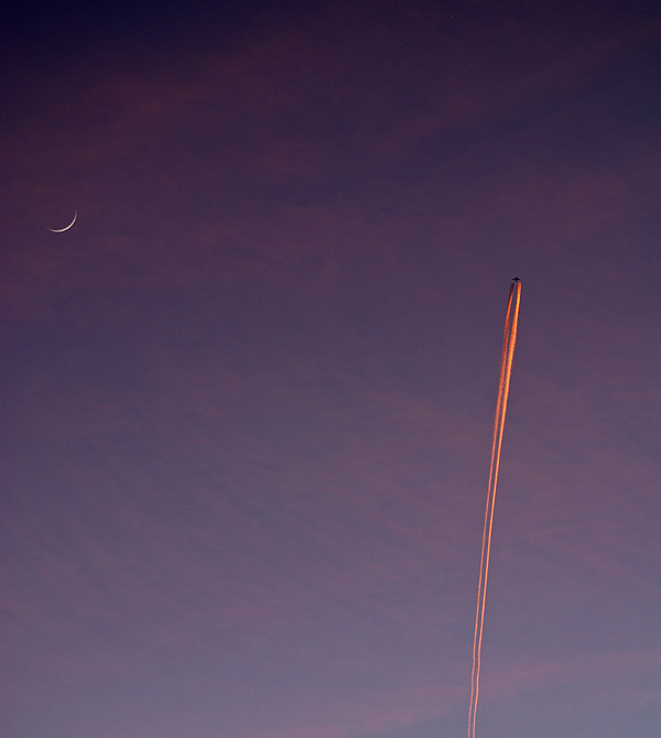 An airplane flies across a purple twilight sky with the crescent moon bright in the background on Dec. 26, 2011 in this photo by skywatcher David Smoyer.