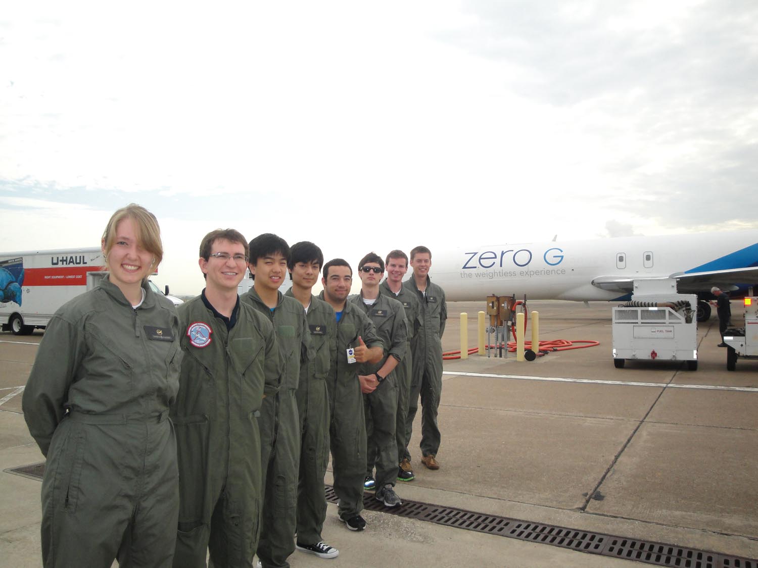 NASA astronaut Mike Fossum poses for a snapshot with the UC San Diego Microgravity Team during a weightless research flight with NASA's Microgravity University on July 19, 2013. The team studied how biofuels burn in zero-gravity conditions. [Read the Full Story]