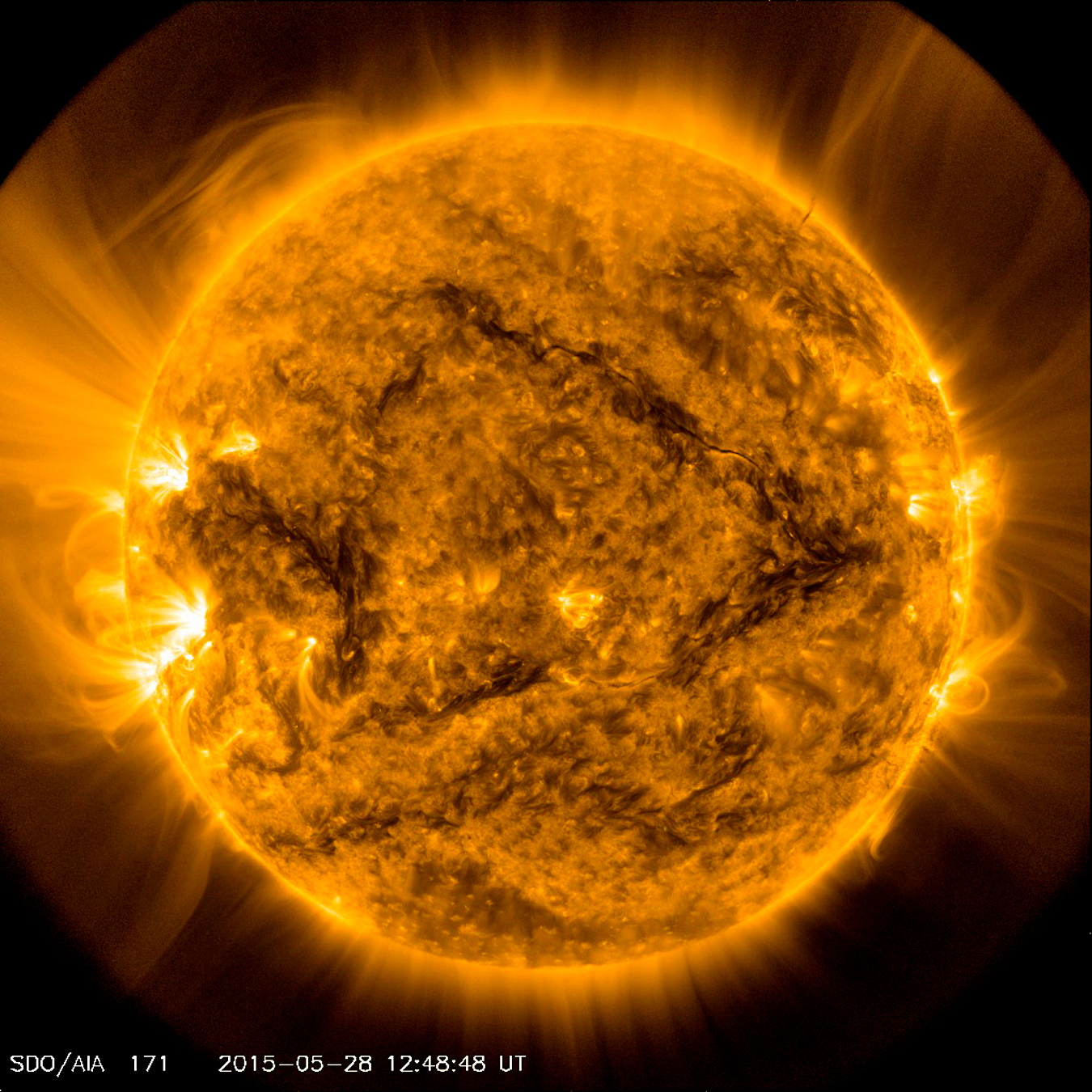 Friday, June 19, 2015: A laterally oriented structure in the sun’s corona (at upper left) appeared to seesaw above the sun for at least two days on May 26-28, 2015, as seen in a still from a video obtained by Solar Dynamics Observatory. SDO imaged the activity in a wavelength of extreme ultraviolet light.