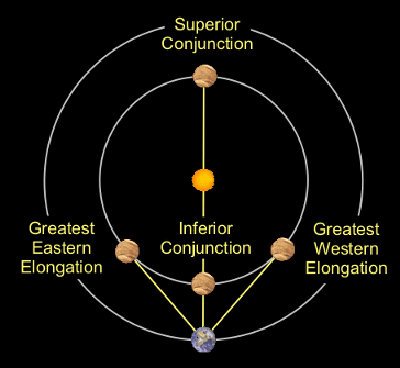 Venus and Mercury orbit closer to the sun than Earth does, so astronomers refer to them as inferior planets. In the sky, inferior planets never venture very far from the sun, alternately appearing after sunset and before dawn as their orbits swing them east and west of the sun, respectively. This has led to Venus being dubbed the Morning Star and the Evening Star. When a planet reaches its maximum angle with the sun, it is said to be at greatest eastern or western elongation; when viewed in a telescope around greatest elongation, Venus is only half illuminated, on the sunward side, just like our semimonthly quarter moons. [Best Telescopes for the Money - 2016 Reviews and Guide]