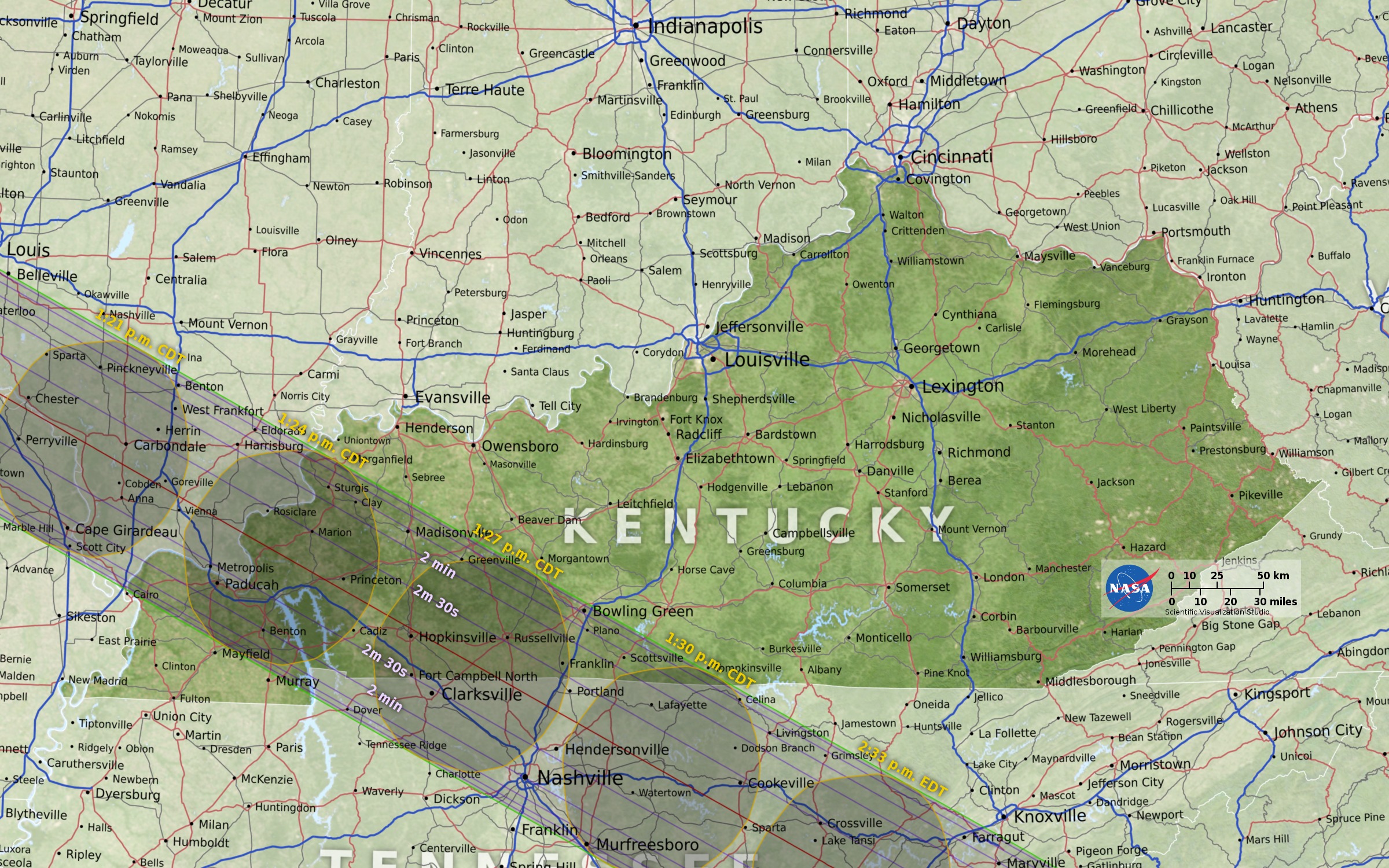The shadow will cross through the southwest part of the Bluegrass State between 1:22 and 1:30 p.m. local time (CDT). About 590,000 people live inside the zone of total eclipse, but what makes Kentucky so special is that a spot between the towns of Princeton and Hopkinsville — along Cerulean Hopkinsville Road (Route 624) and just to the east of the intersection with J Stewart Cemetery Road — is where astronomers predict that the point of "greatest eclipse" will occur. That's where the axis of the moon's dark shadow cone passes closest to the Earth's center. Here, totality will last 2 minutes and 40.1 seconds, beginning at 1:24 p.m. CDT. That's about 40 seconds longer than the Kentucky Derby! Meanwhile, about 45 miles to the west, the city of Paducah will experience 2 minutes and 20 seconds of totality, starting at 1:22 p.m. CDT. Five minutes later, Bowling Green will watch the sun wink out for 1 minute and 27 seconds. It is too bad that Kentucky's largest city, Louisville, lies outside of the path of totality. It will see 95.8 percent of the sun eclipsed at 2:27 p.m. Eastern Daylight Time.
