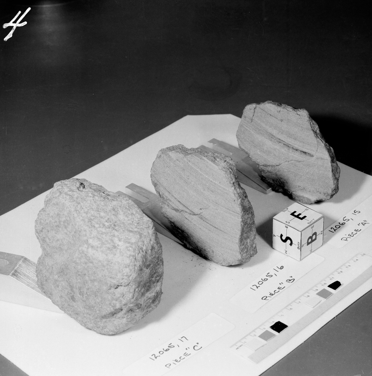 One of the moon rocks, sample 12065, brought back from the Apollo 12 lunar landing mission has been cut into three pieces for examination.