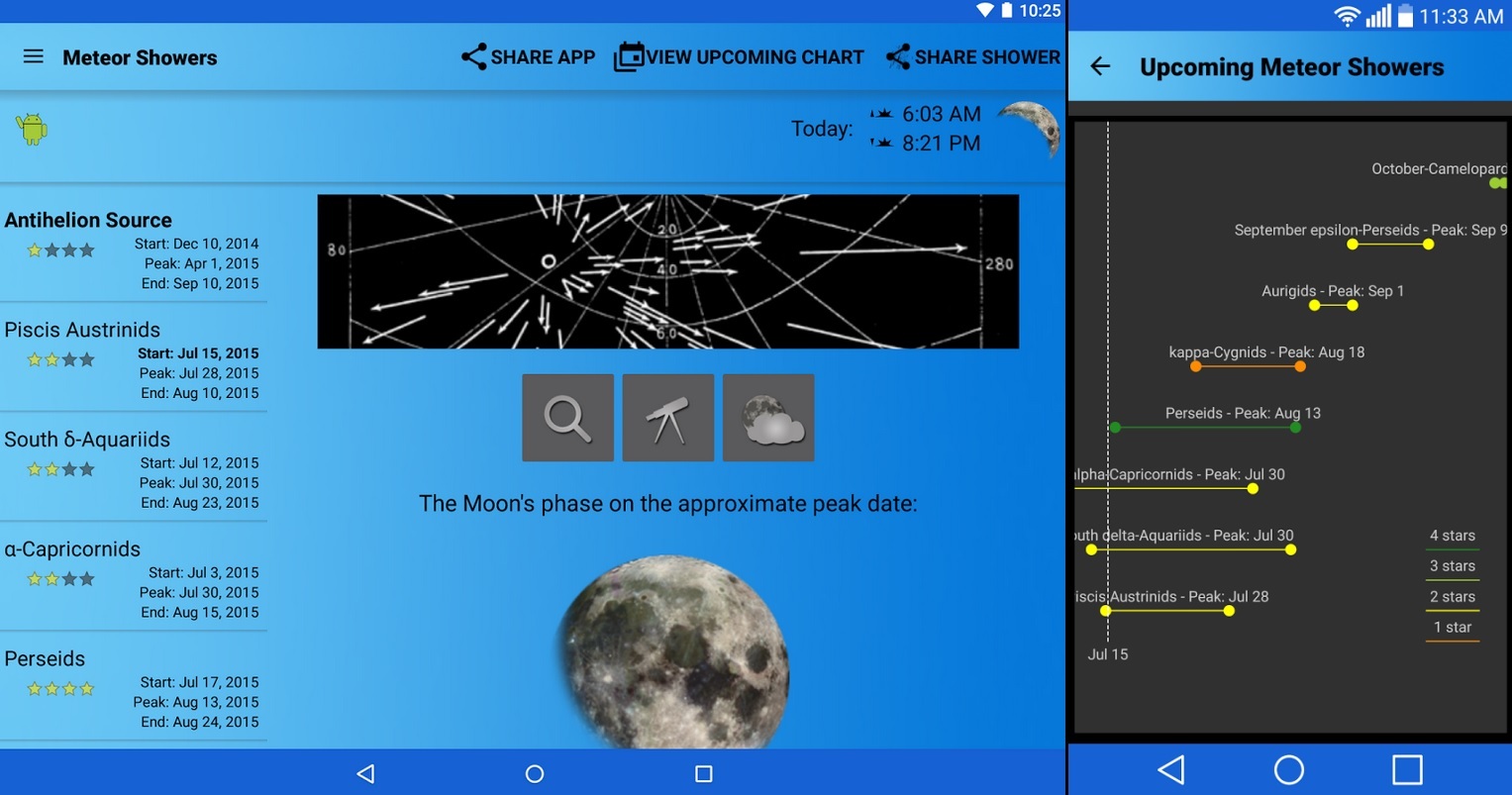 As a supplement to sky-charting apps, you can use dedicated apps to follow showers and count meteors. The free Meteor Shower Calendar app for Android and iOS issues notifications of upcoming showers and includes weather forecasts, moon phases and historical data. The American Meteor Society is a terrific online resource for meteors. The free app for Android shows current meteor and moon information, a summary for the year and sky maps of radiant locations, as well as provides an interactive method to count meteors by aiming your device at the sky and swiping the screen to show the meteor direction. You'll be doing citizen science!