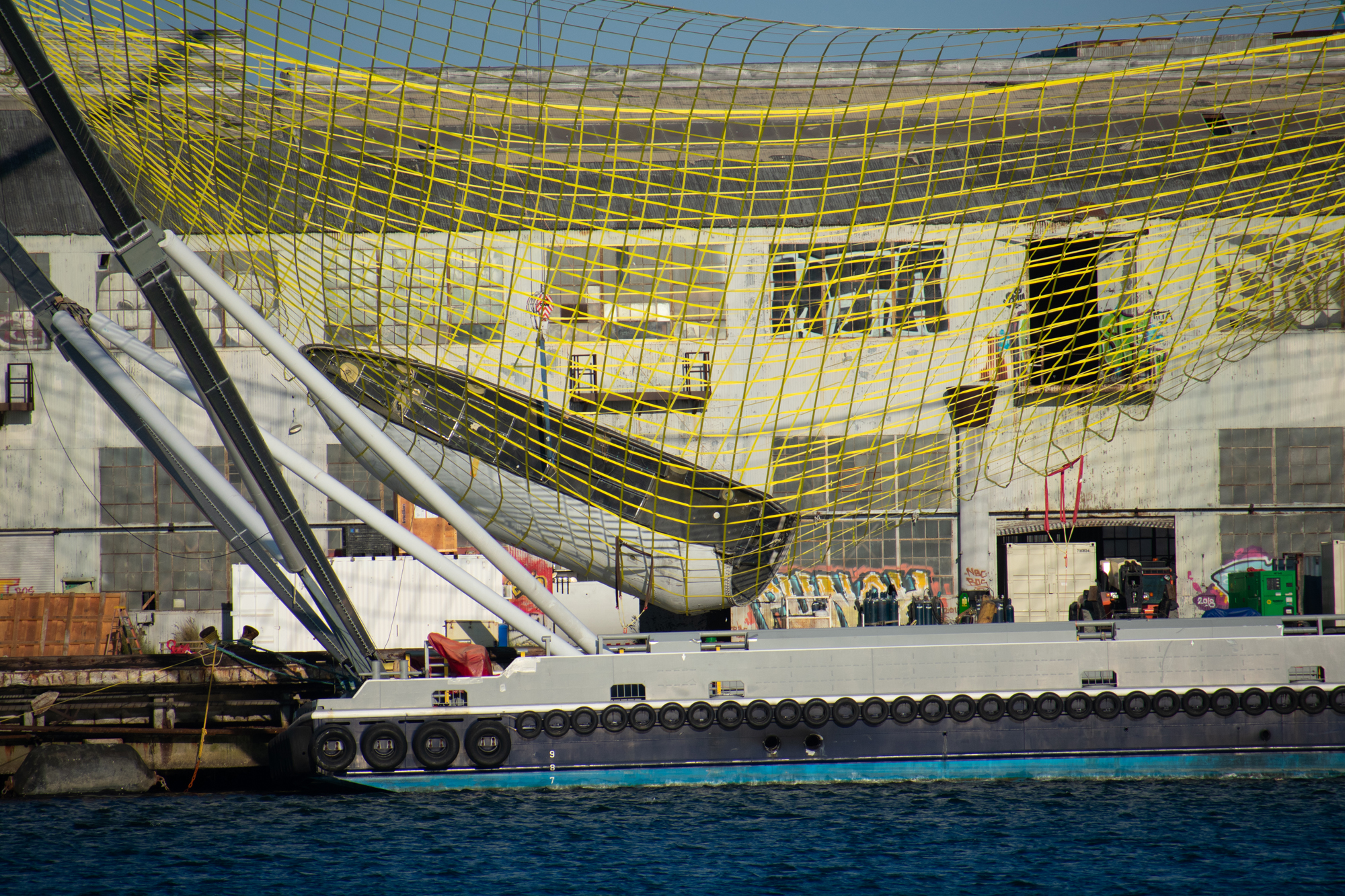 A crane was used to repeatedly lift and lower a fairing half in Mr. Steven's net on Aug. 13, 2018.
