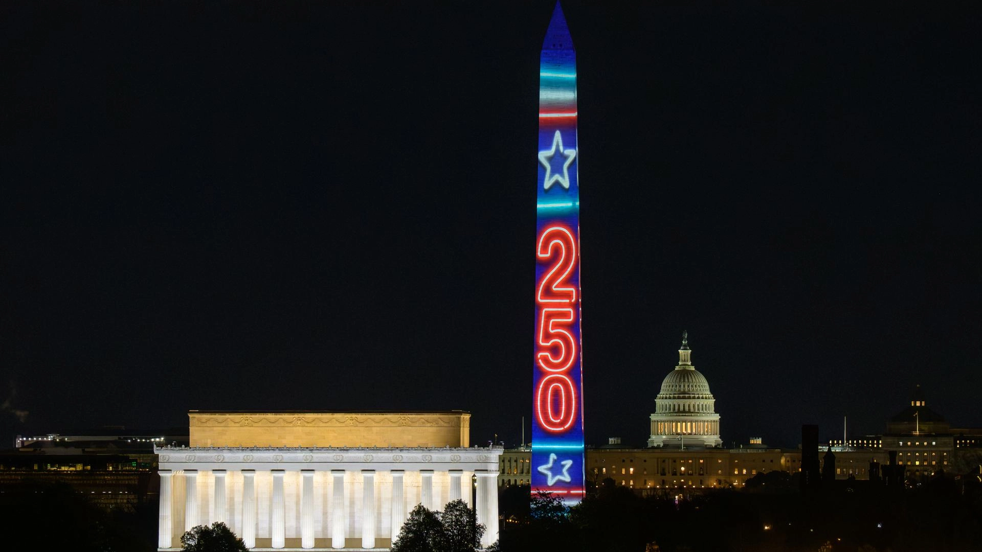 On New Year's Eve 2025, the monument became the centerpiece of a large public show tied to the kick off of "America 250" observances. Reporting by the Washington Post described a projection that turned the obelisk into a towering "birthday candle" paired with a fireworks display.