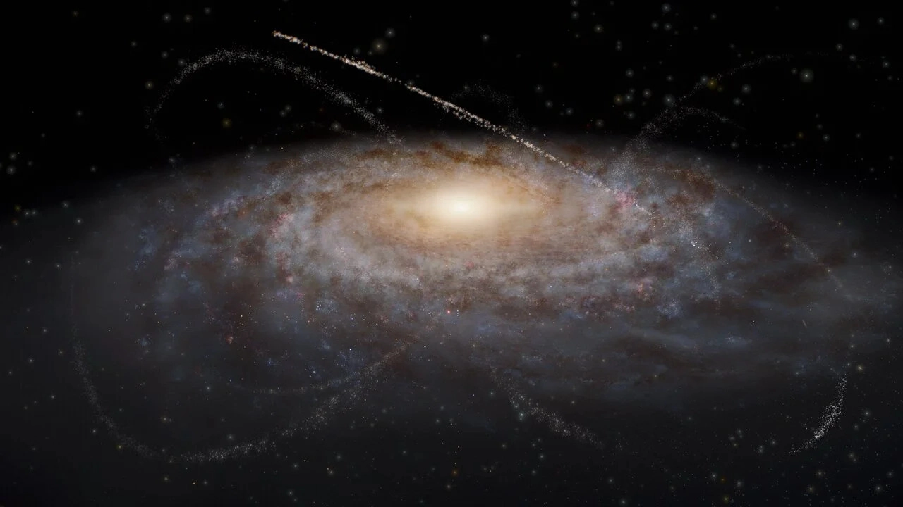 Stellar streams are arcing threads of stars that form when compact star clusters travel through the Milky Way's gravitational field, shedding stars that are stretched out into long, trailing ribbons.