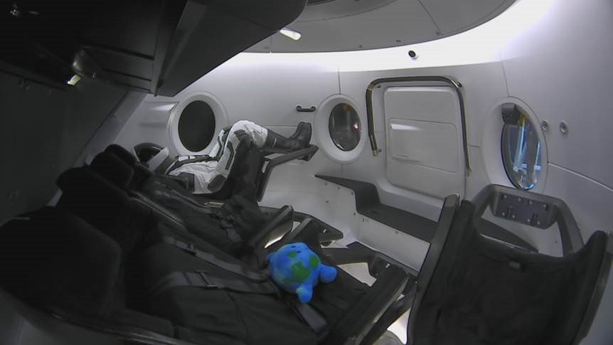 A Celestial Buddies Earth was not the only "passenger" on the Crew Dragon — SpaceX also included an anthropomorphic test dummy (ATD) called Ripley. The dummy was strapped into one of the seats in the Dragon while the "zero-g indicator" was placed on top of a seat with no restraints other than a long tether connecting it to one of the seats.