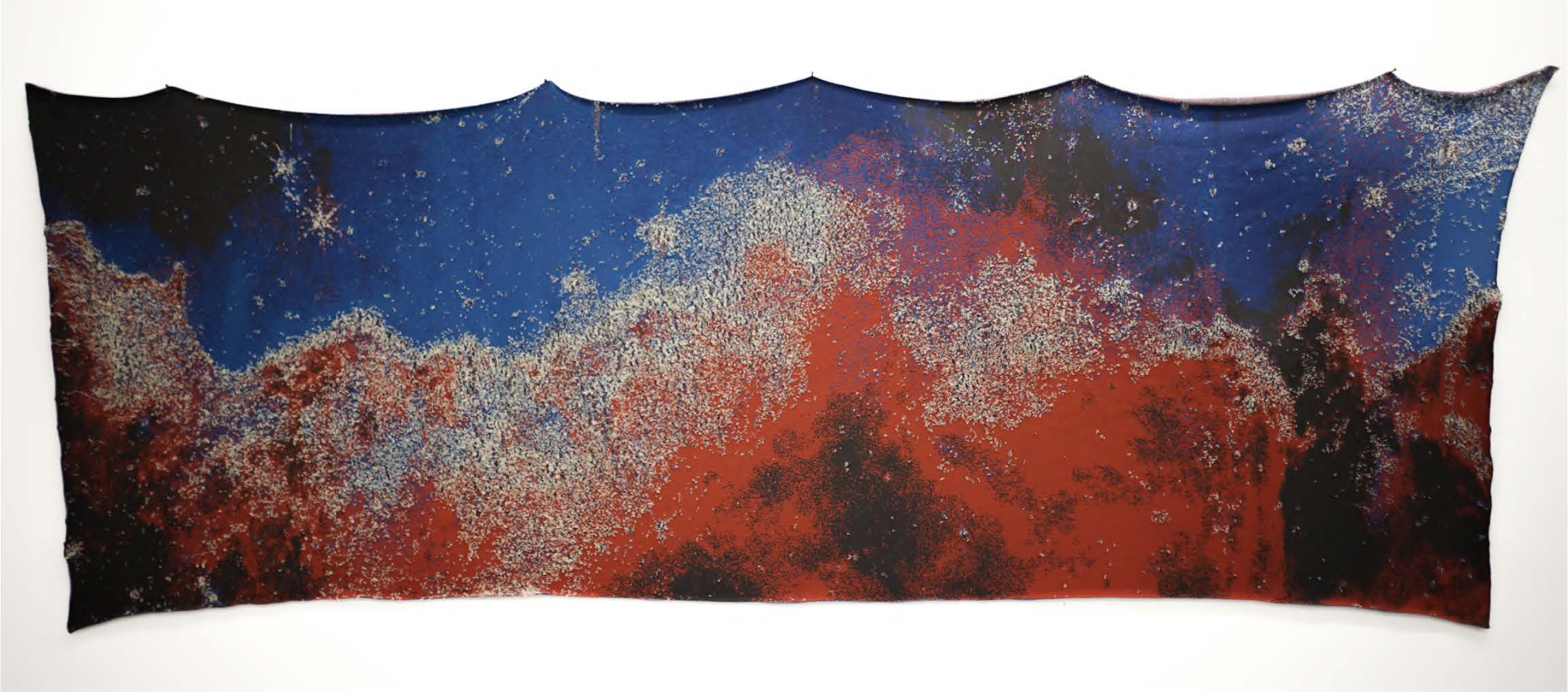 In the textile series, high-resolution analyses of images become woven structures and layering instructions. Silk and chiffon banners (Pillars of Creation: Hubble/Legacy/Webb, Rho) and robotic-loom cotton weavings (Carina, Tarantula) are tuned through natural dyes, thread weights, and warp/weft densities until they carry not just an image but the sensation of depth, diffusion and a sense of birth and destruction that happens in the lifecycle of a nebula. Alongside these, the laser-cut hexadecimal canvases act as quiet footnotes, reminding us that even our most intimate images are ultimately parsed as code and speak to the Netherlands deep roots in astronomy.