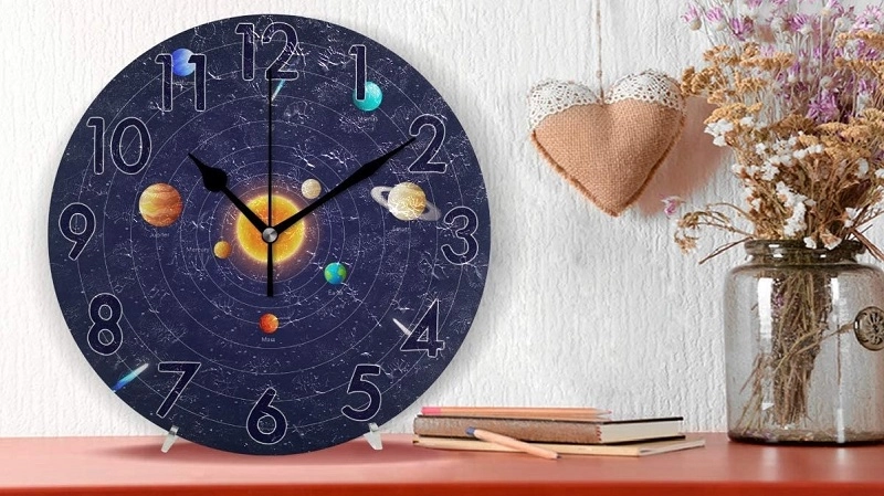 Our top choice might be a little busy for you, so that’s why the Naanle Printed Space Clock is our second pick. The numbers are bold and can be read from anywhere in the room. Plus, it provides vibrant colors and can serve as an accent piece on your wall. Which will you pick to add a little space to your space?