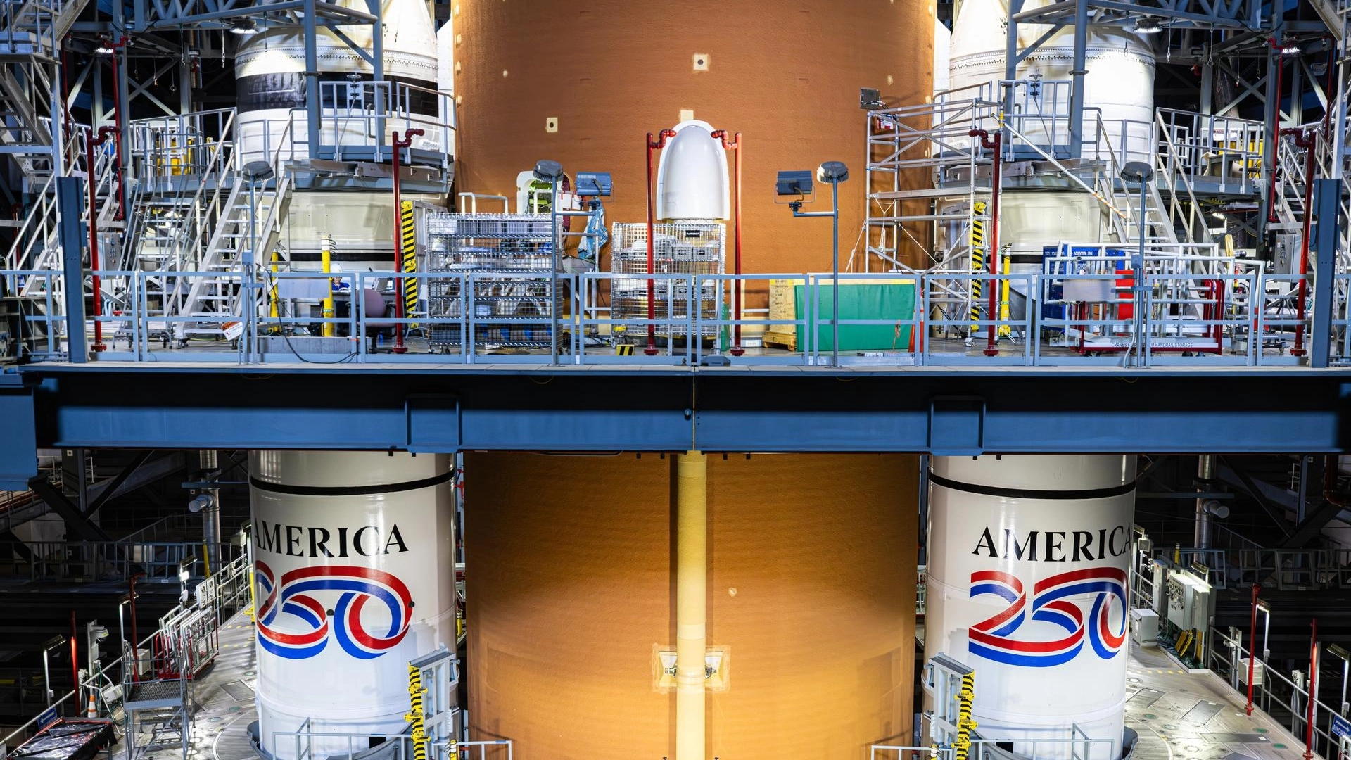 The hardware that will fly the astronauts moonward includes two 177-foot-tall (54 meters) twin boosters that are the backbone of the giant Space Launch System (SLS) rocket's launch power. Recently, the two boosters that will fly on the Artemis 2 mission had an "America 250" emblem painted on their sides, in honor of the upcoming. 250th anniversary of the signing of the Declaration of Independence.