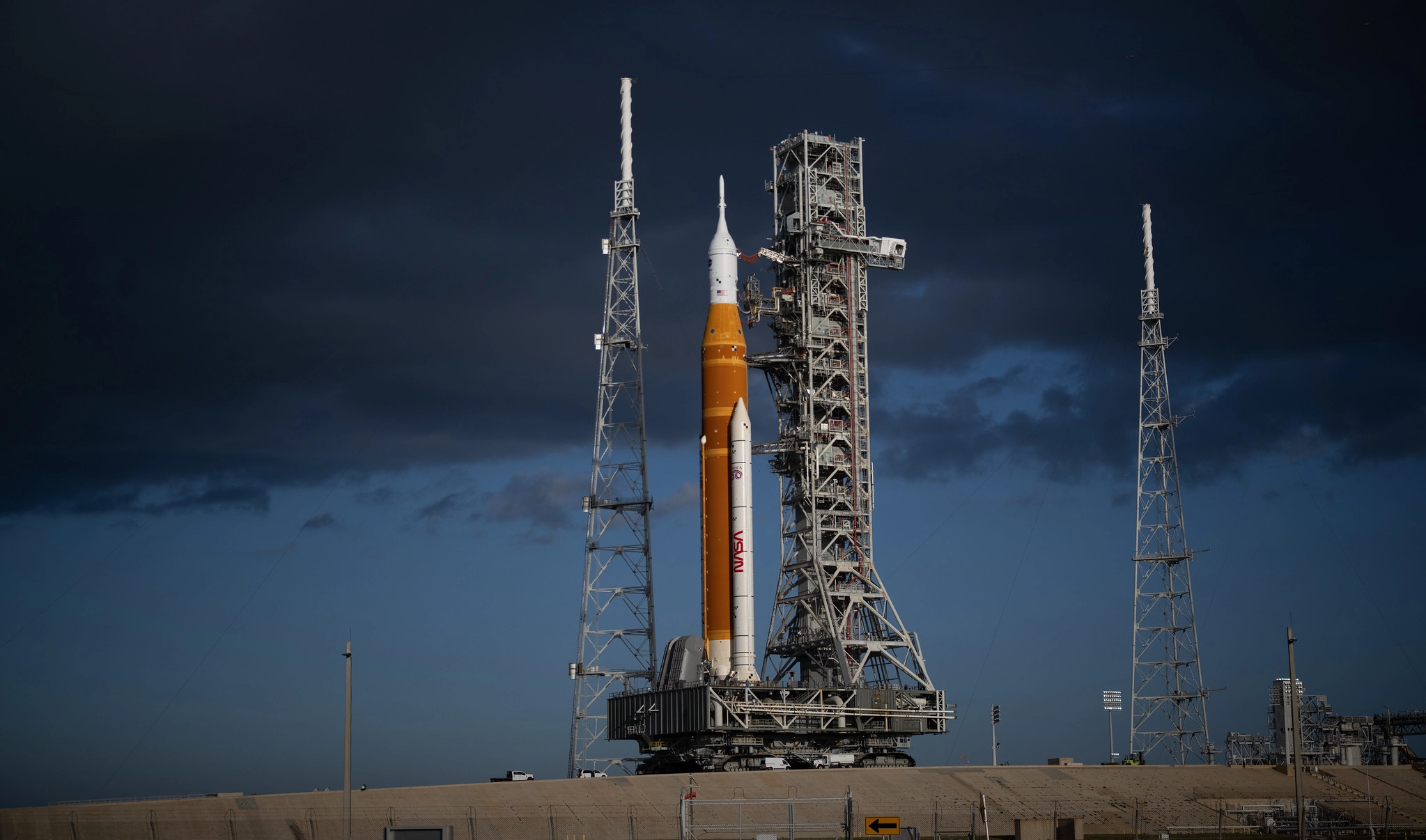 SLS and its Orion crew capsule arrived at the pad around 10 a.m. EDT (1400 GMT) on Friday. First motion occurred earlier that same morning at 12:20 a.m. EDT (0420 GMT), with SLS, Orion and their mobile launch platform (MLP) secured atop NASA's crawler-transporter 2 vehicle for the 4-mile (6.4 kilometers) trek.