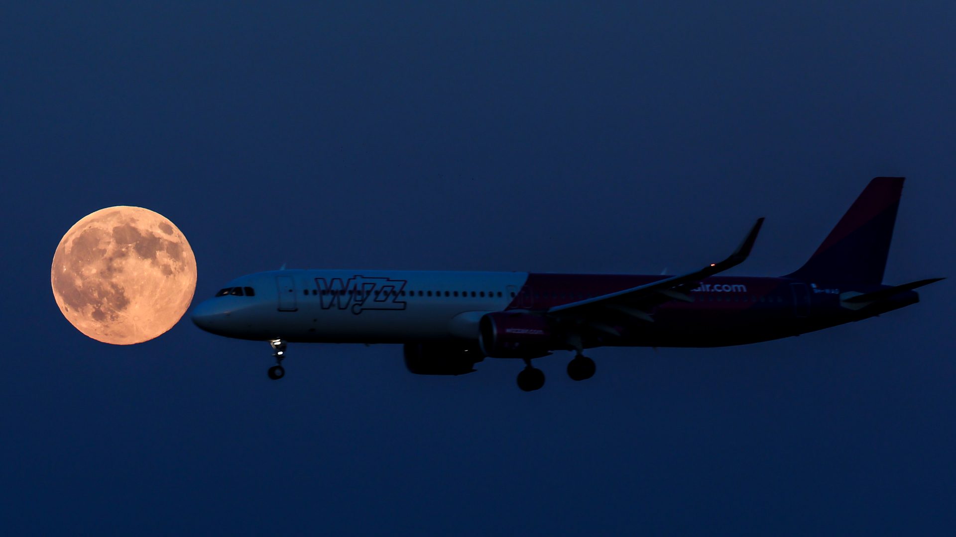 Photographer David Balogh managed to catch a well-timed shot of a commercial jet appearing to gently nose a yellow full moon from his vantage point near Budapest Airport in Hungary, as the lunar disk climbed higher in the darkening sky.